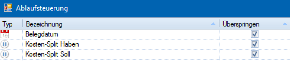 Im Buchungsgrid unten kann via rechter Maustaste der Punkt „Ablaufsteuerung“ gewählt werden. Danach können die Felder ausgewählt werden, welche in der Buchungsmaske übersprungen werden sollen.