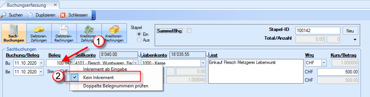 → Rechte Maustaste auf Belegnummer => kein Inkrement