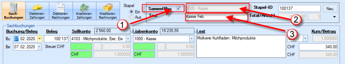 Wenn zudem das Feld „Sammel Bhg“ (1) aktiviert wird, kann ein gemeinsames Konto (2) und einen gemeinsamen Text (3) gewählt werden, welches auf jeder Buchung der entsprechenden Stapelbuchung angewendet wird, z. B. Kasse: