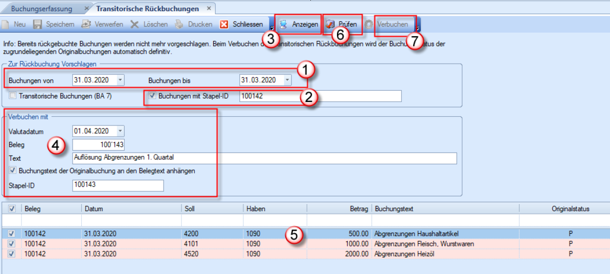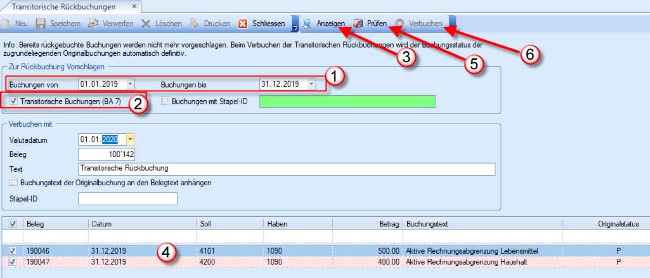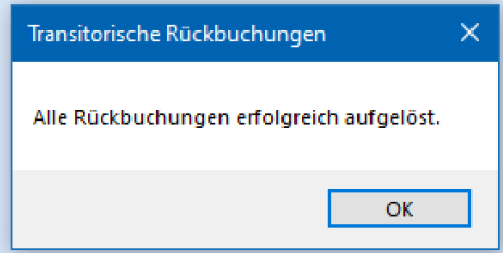 Mit dieser Funktion können entweder transitorische Buchungen im neuen Geschäftsjahr rückgebucht werden oder Buchungen mit Stapel-ID (z. B. Abgrenzungsbuchungen) im Folgemonat aufgelöst werden.
