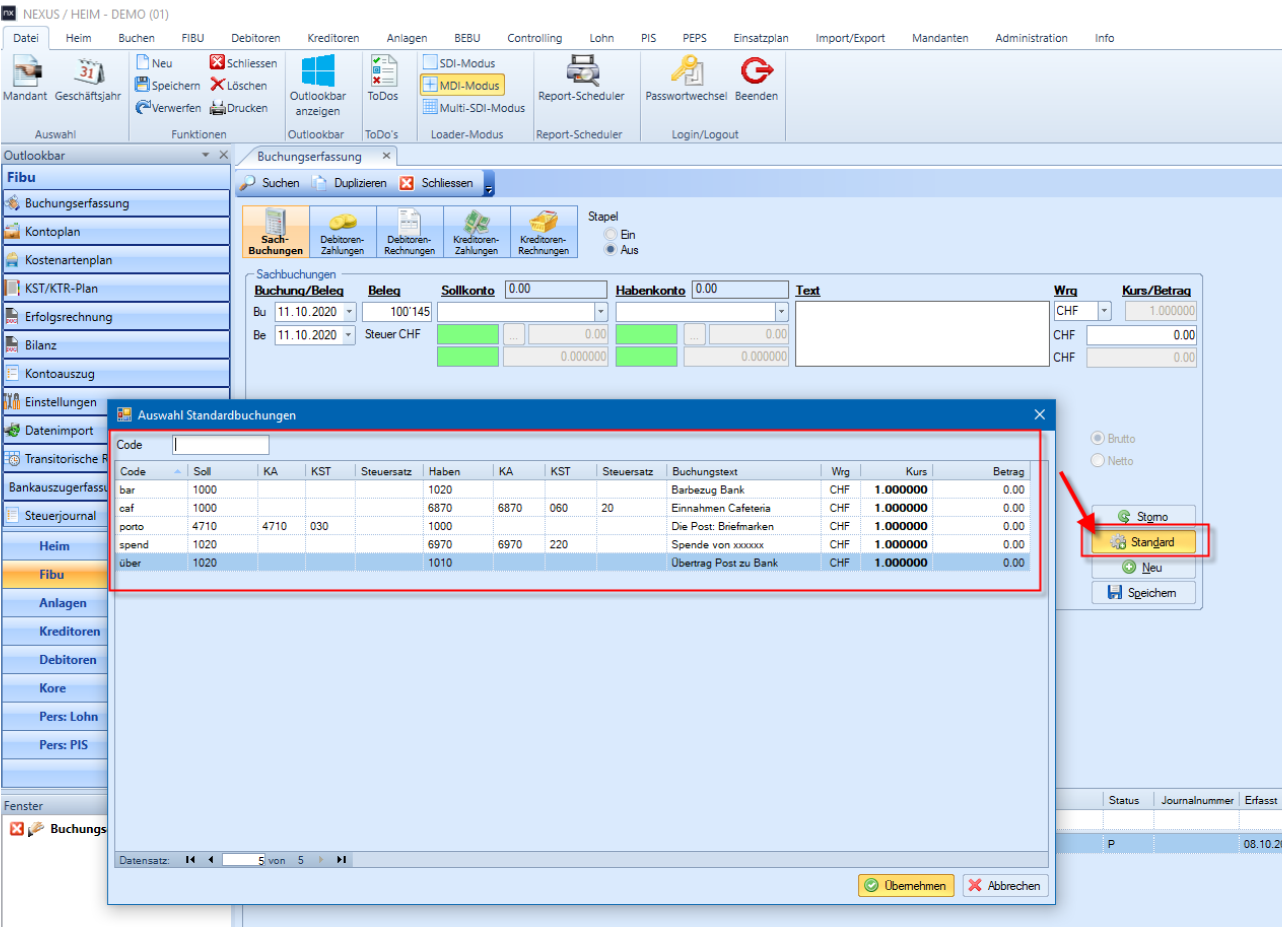 Wiederkehrende Buchungen können in der Buchungserfassung der Sachbuchungen über den Button „Standard“ aufgerufen und als Vorlage übernommen werden