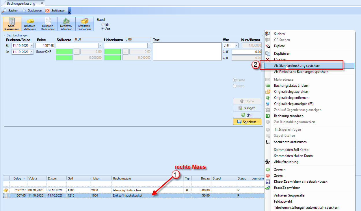 Mittels rechter Maustaste kann eine getätigte Buchung gewählt und als Standardbuchung gespeichert werden.