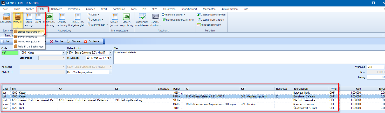 Gespeicherte Standardbuchungen können mit dieser Funktion bearbeitet werden, z. B. kann der Betrag entfernt werden: