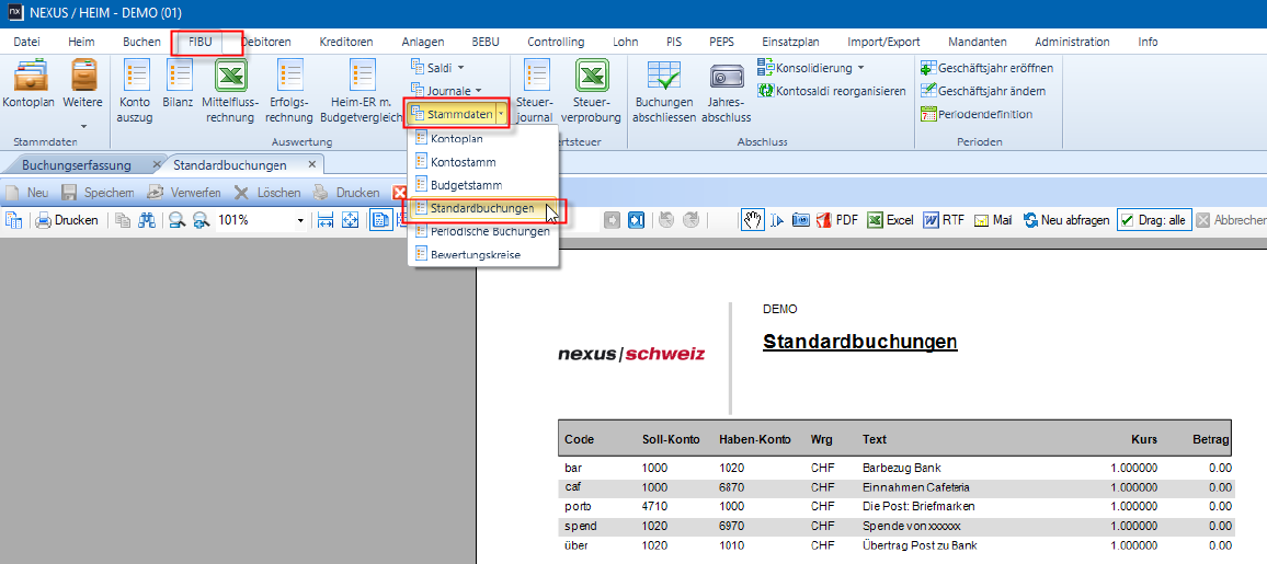 Unter Finanzbuchhaltung / Auswertungen / Stammdaten / Standardbuchungen lässt sich eine Liste der vorhandenen gespeicherten Standardbuchungen drucken.