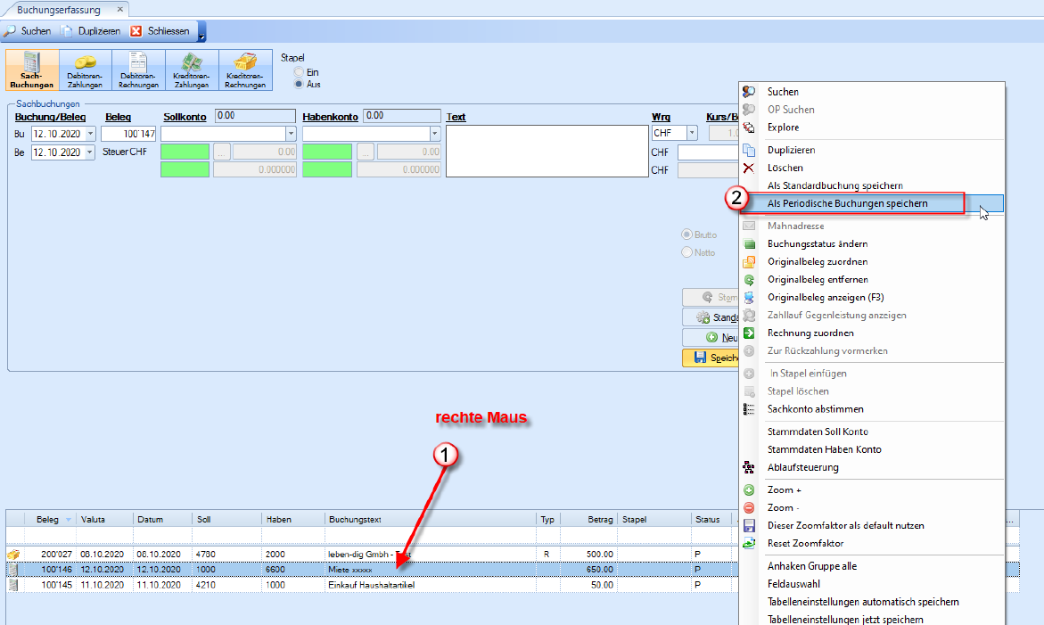 Mittels rechter Maustaste kann eine getätigte Buchung gewählt und als Periodische Buchung gespeichert werden.