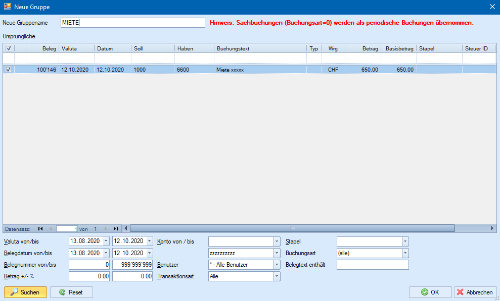 Momentan kann diese Eröffnung nur über eine neue Gruppe erfolgen. Wenn einer Gruppe weitere Buchungen hinzugefügt werden sollten, kann dies in der Verwaltungsfunktion der Periodischen Buchungen (siehe übernächstes Unterkapitel "Auslösen Periodische Buchungen") vollzogen werden.