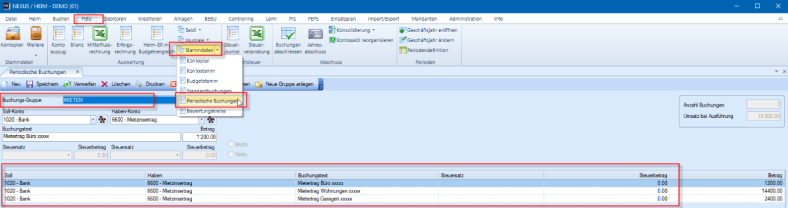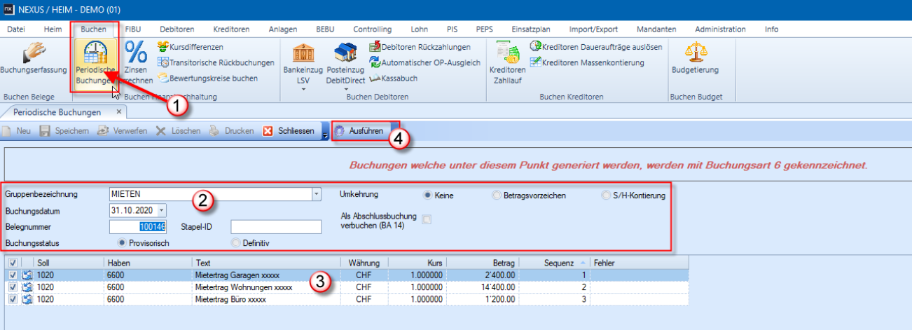 Mittels der Funktion „Periodische Buchungen“ (1) können Buchungen, welche einer Buchungs-gruppe angehören, aufbereitet (Punkt (2) Gruppe wählen und Buchungsangaben machen) und nach der Kontrolle der aufbereiteten Buchungen (3) mittels Button „Ausführen“ (4) erstellt werden:
