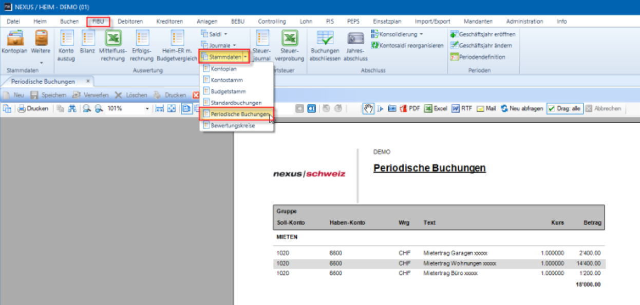 Unter Finanzbuchhaltung / Auswertungen / Stammdaten / Periodische Buchungen lässt sich eine Liste der vorhandenen gespeicherten Periodischen Buchungen erstellen.