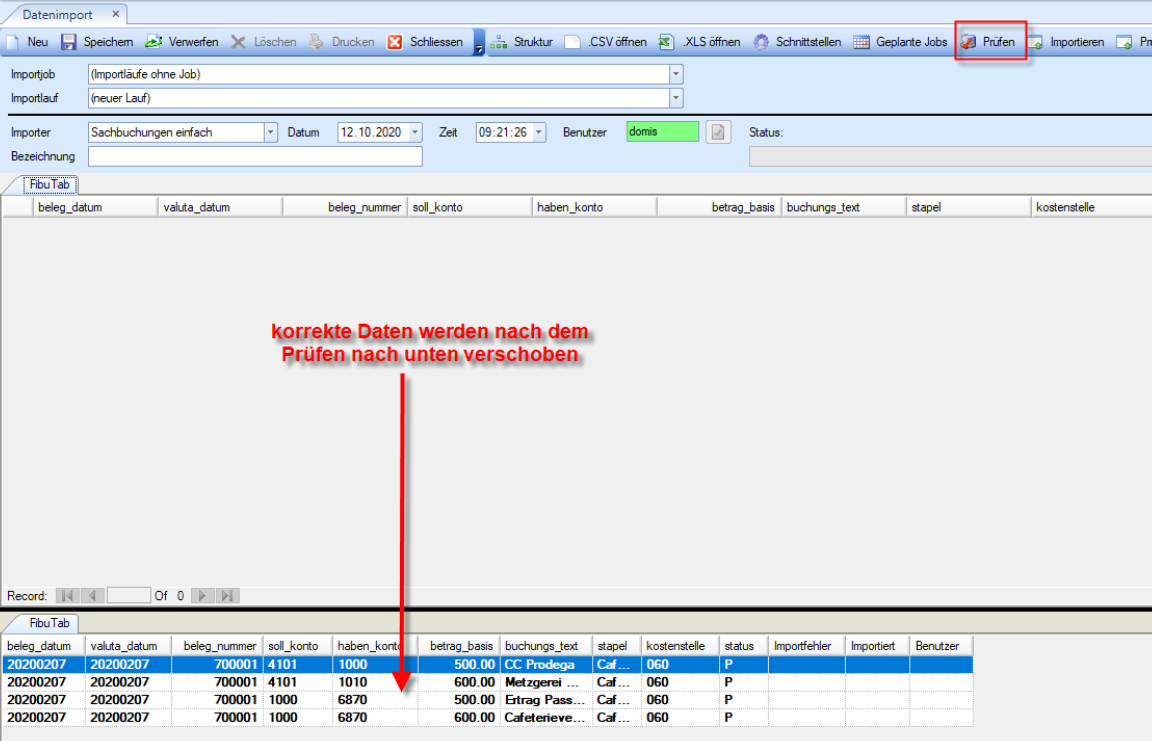 Danach werden die geladenen Daten mittels Button „Prüfen“ auf Gültigkeit kontrolliert und wenn keine Fehler gefunden wurden, nach unten verschoben:
