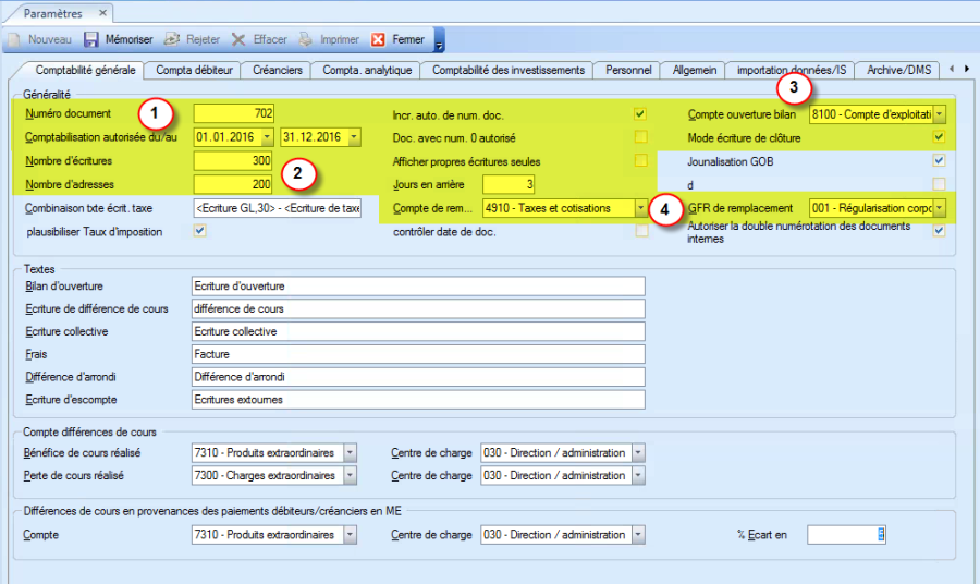 - Définir le compte pour l'ouverture du bilan (pour les écritures d'ouverture lors de la clôture annuel)