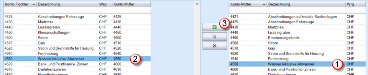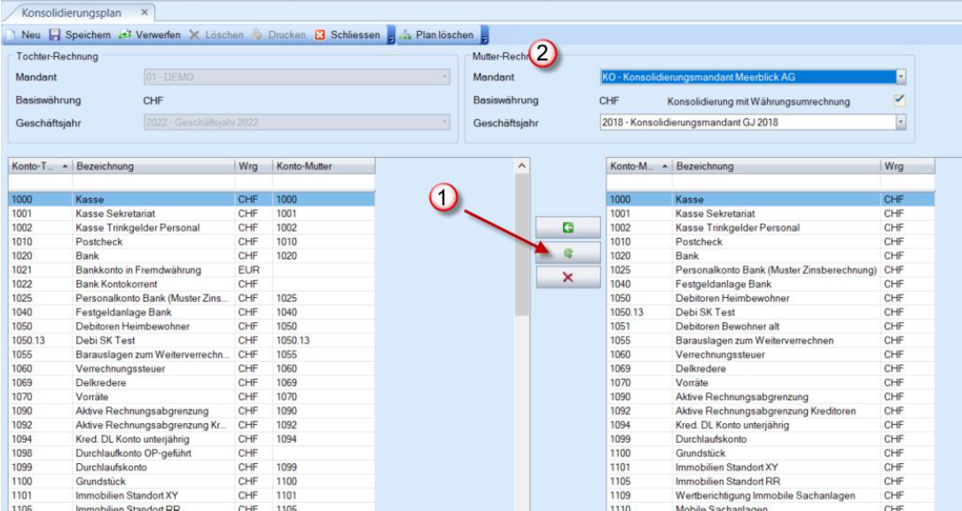 Mit dem Button (1) übernimmt das Programm automatisch die Konti, bei welchen die Konto-nummern bei Tochter- und Mutterfirma identisch sind.