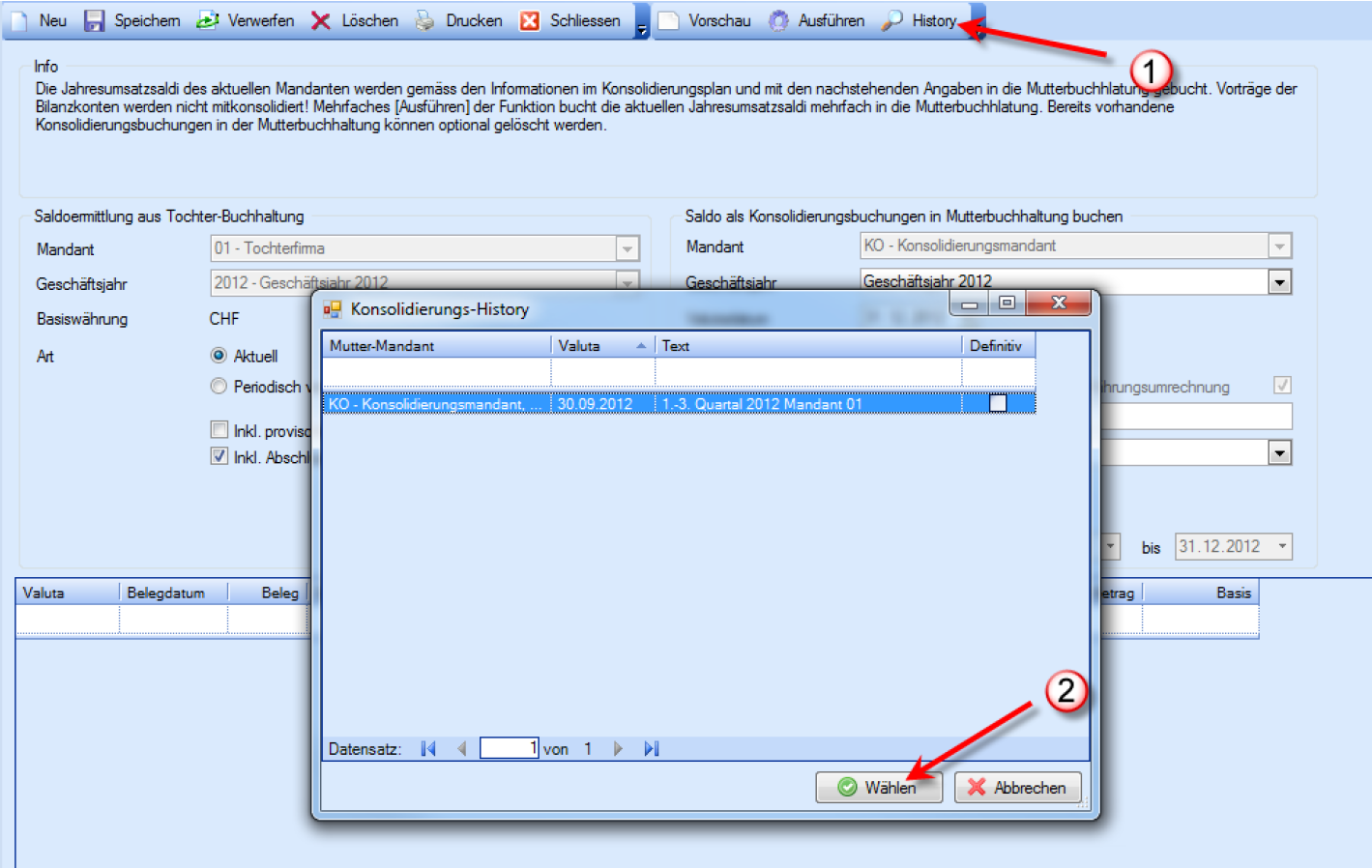 Mit dem Button History (2) können Sie überprüfen, ob sich in diesem Geschäftsjahr bereits ver-arbeitete Konsolidierungsläufe befinden. Per Button „Wählen“ übernehmen Sie die Detaildaten vom ausgewählten Konsolidierungslauf.