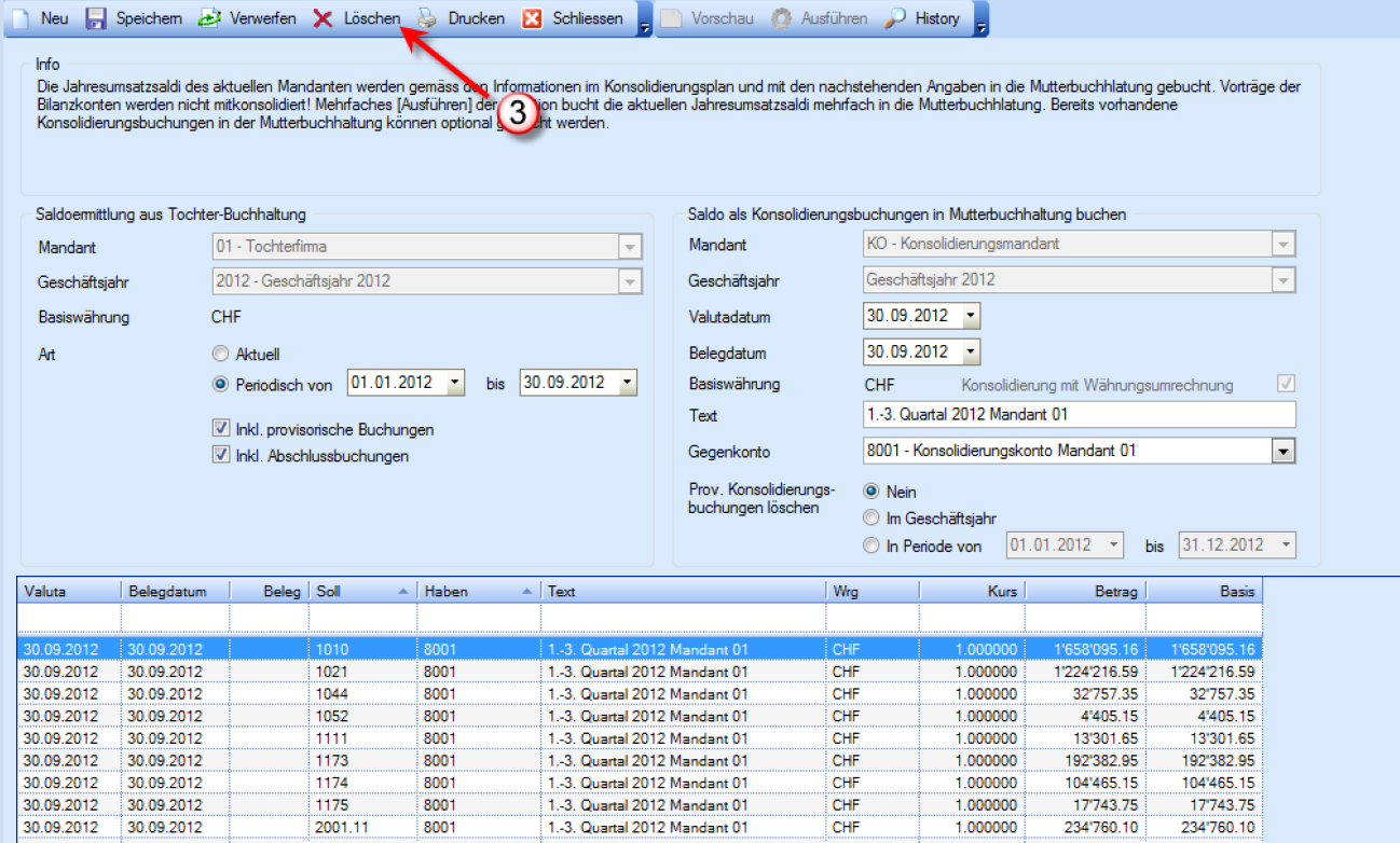 Konsolidierungsläufe können mehrfach durchgeführt werden, indem bereits verarbeitete Läufe vorgängig wieder entfernt werden.