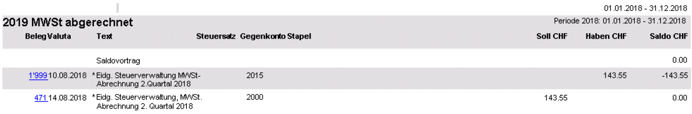 1. Die MwSt-Abrechnung als Buchungsbeleg verwenden und den Saldo mittels einer Sachbuchung vom Konto 2015 wegbuchen: 2015 an 2019 (MwSt abgerechnet)