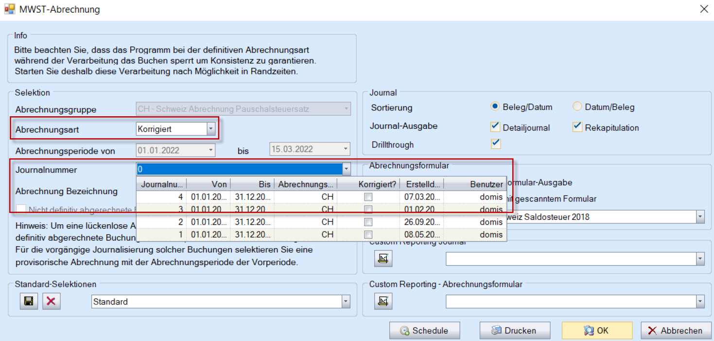 - die Journalnummer der zugehörigen definitiven Abrechnung ausgewählt.