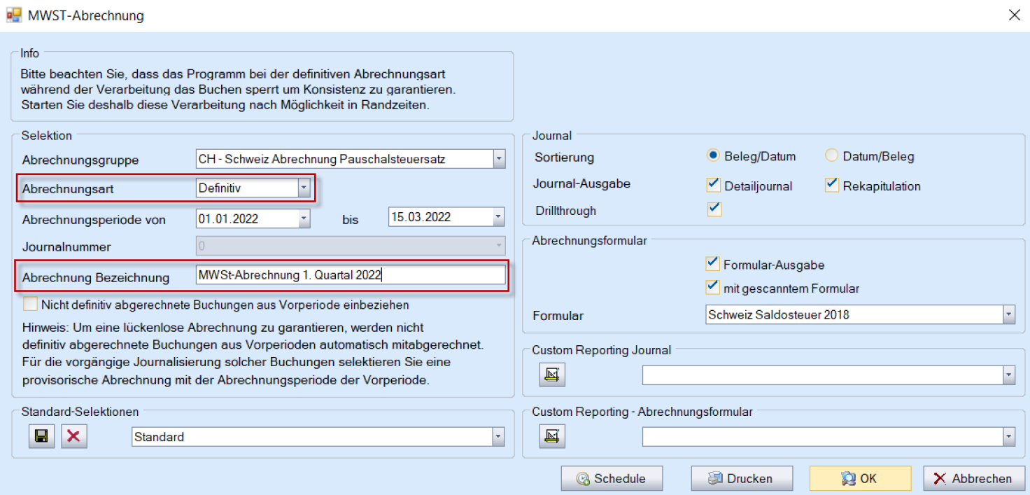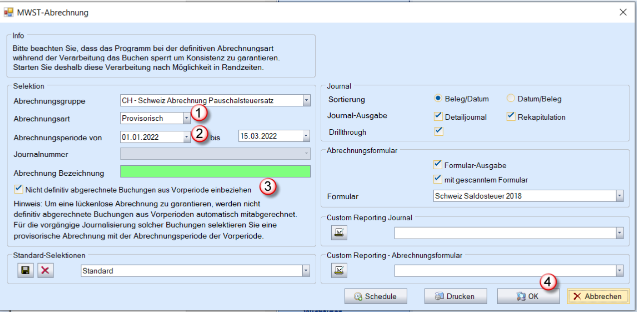 3. Flag „Nicht definitiv abgerechnete Buchungen aus Vorperiode einbeziehen“ je nach dem Aktivieren oder Deaktivieren