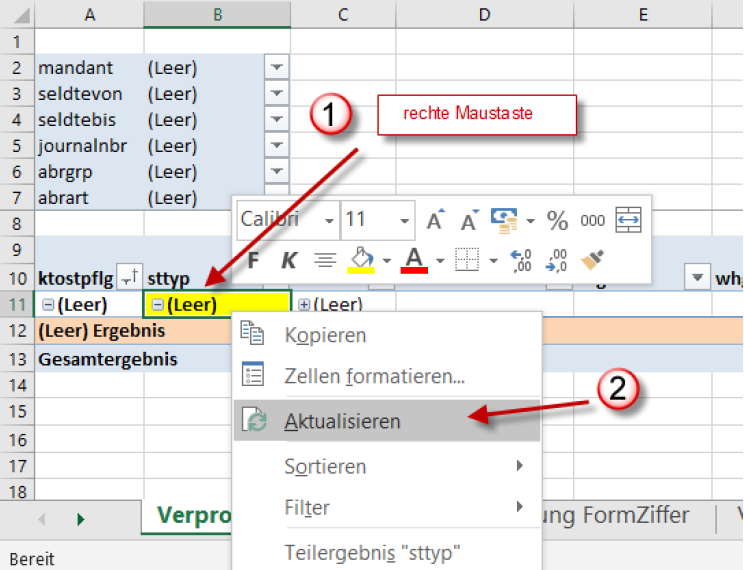 Nach dem Exportvorgang öffnet sich ein Excel-File. Dort muss die Pivot-Tabelle aktualisiert wer-den, damit die exportierten Daten angezeigt werden.
