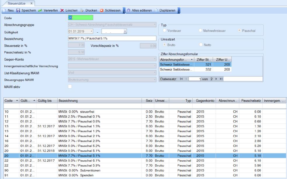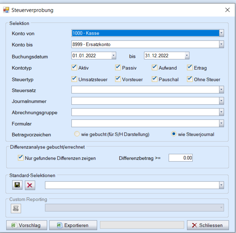 Mittels der im Programm integrierten MwSt-Verprobung werden bei allen Bewegungen die verbuchten Steuerbeträge mit dem verwendeten Steuercode zurück gerechnet und geprüft, ob die Mehrwertsteuer korrekt im System verarbeitet wurde oder ob Differenzen bestehen.