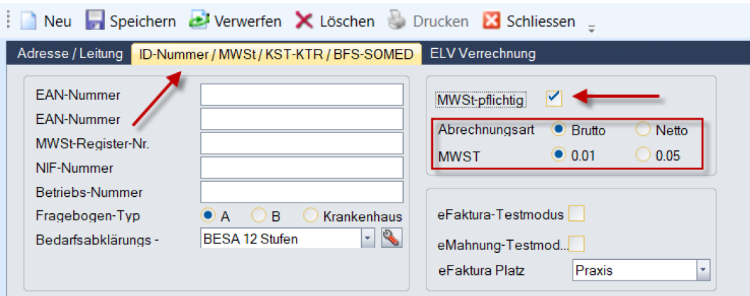2. Wechsel auf Register „ID-Nummer / MwSt….“, Flag „MwSt-pflichtig“ aktivieren und an-passen Abrechnungsart und MwSt-Rundung. Mit „Speichern“ und „Schliessen“ kann die Mandanteneinstellungen wieder verlassen werden.