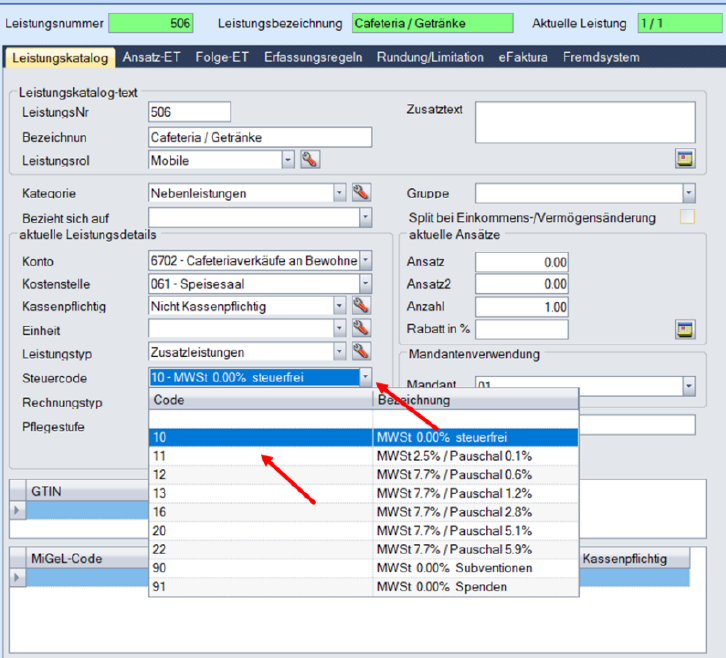 2. Öffnen Leistung und eintragen des korrekten MwSt-Codes