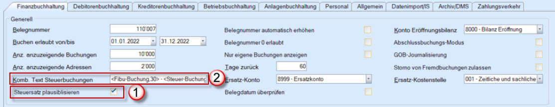 - Steuersatz plausibilisieren sollte unbedingt aktiviert sein. Es wird so verhindert, dass eine Buchung auf ein Konto mit einem hinterlegten Steuersatz ohne Mehrwertsteuerbuchungen geschrieben werden kann.