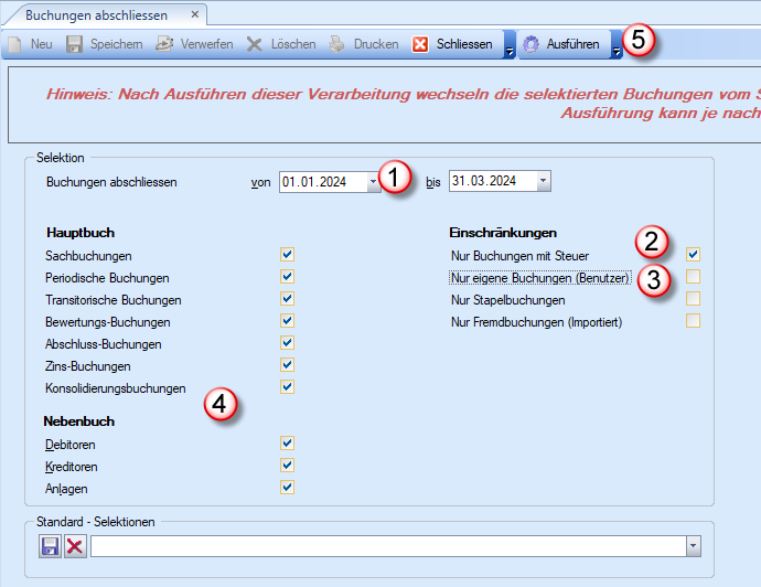 Bei allen im Selektionsformular ausgewählten Buchungsarten werden die Buchungen mit MwSt-Code auf Status „D“ (Definitiv) gesetzt.