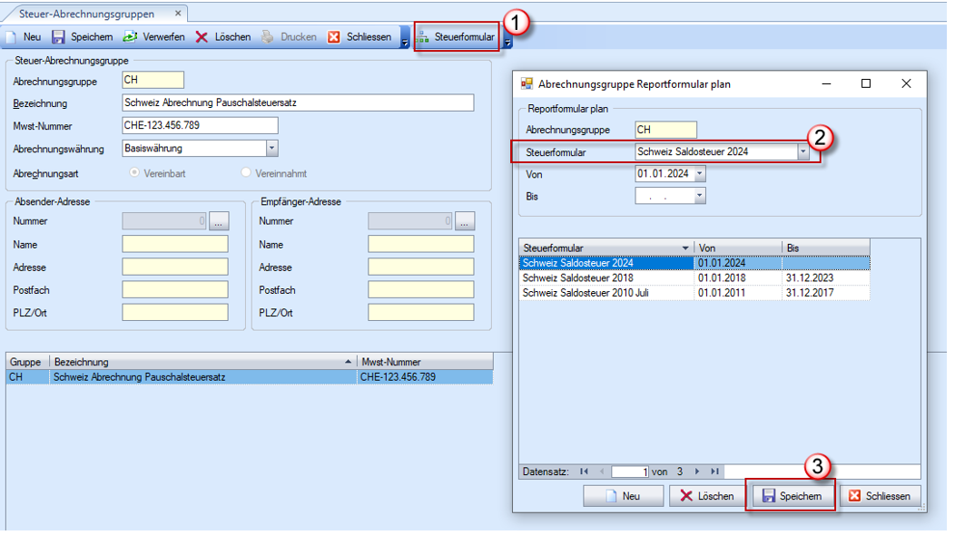 - Beim Eintrag „Schweiz Saldosteuer 2024“ das Bis-Datum entfernen.