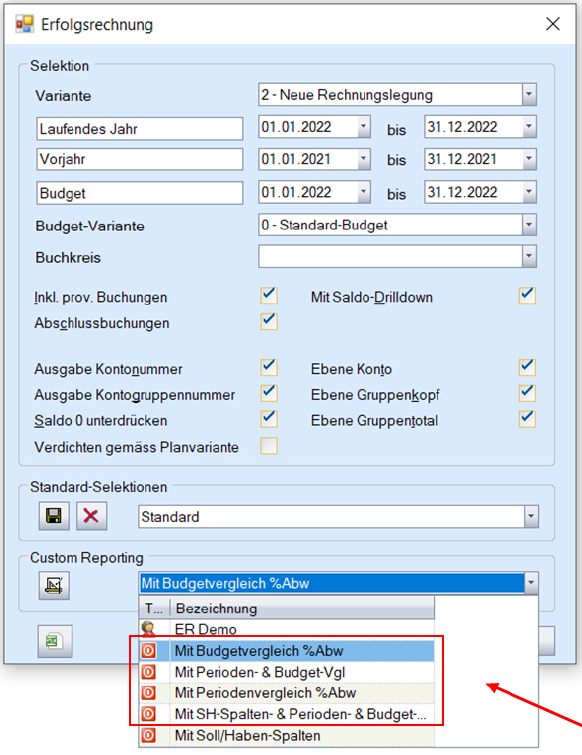 Das Fibu-Budget kann mit der Erfolgsrechnung ausgewertet werden. Dazu bitte einen vorhandenen Custom Report mit Budgetvergleich auswählen:
