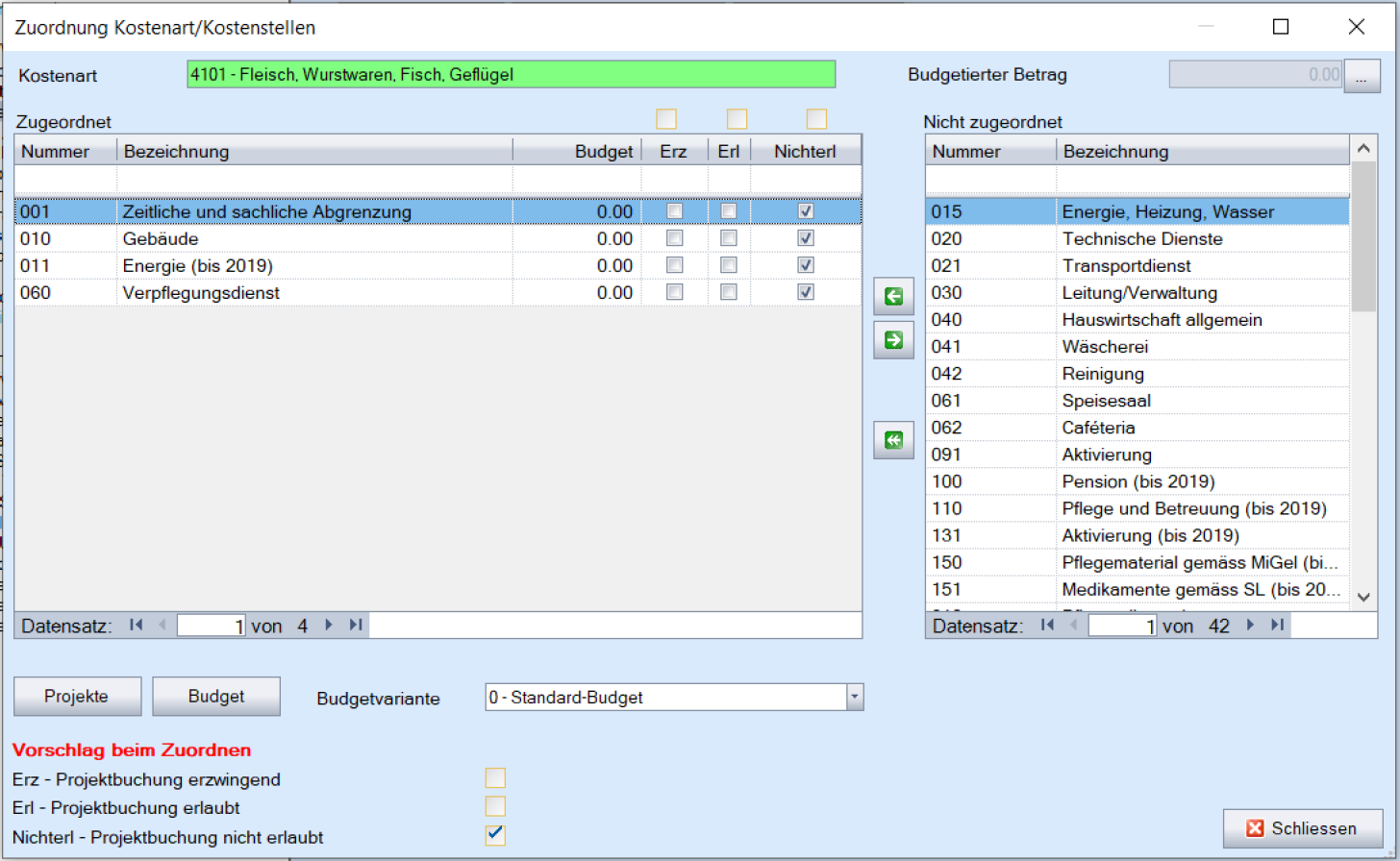 Es kann pro Konto eine Kostenstelle vorgeschlagen werden (Nicht fixiert) oder auf Wunsch fix vergeben werden (Fixiert).