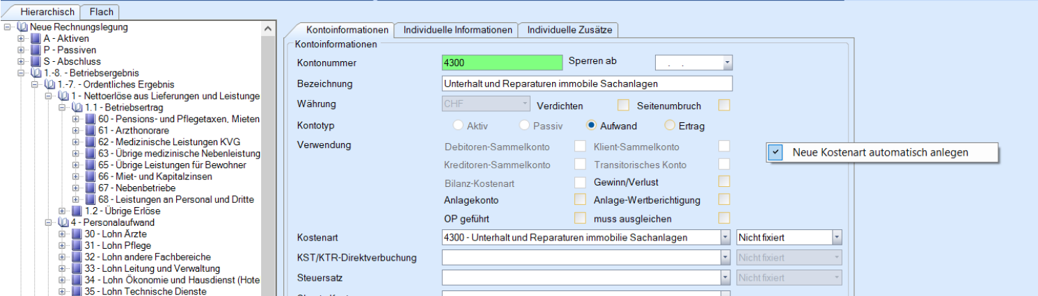 Wenn ein Konto neu eröffnet werden soll: Klick auf rechte Maustaste in folgender Maske und die Funktion «Neue Kostenart automatisch anlegen» aktivieren. Somit wird automatisch beim Anlegen eines neuen Kontos auch die entsprechende Kostenart angelegt.