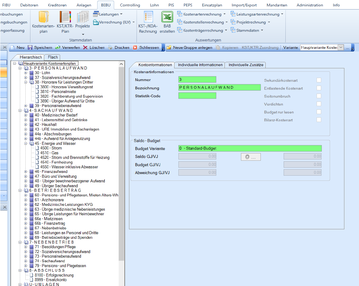 Die Erstellung und Bearbeitung Auswertungsvarianten sind im Kontoplan wie auch in den Kostenarten möglich.