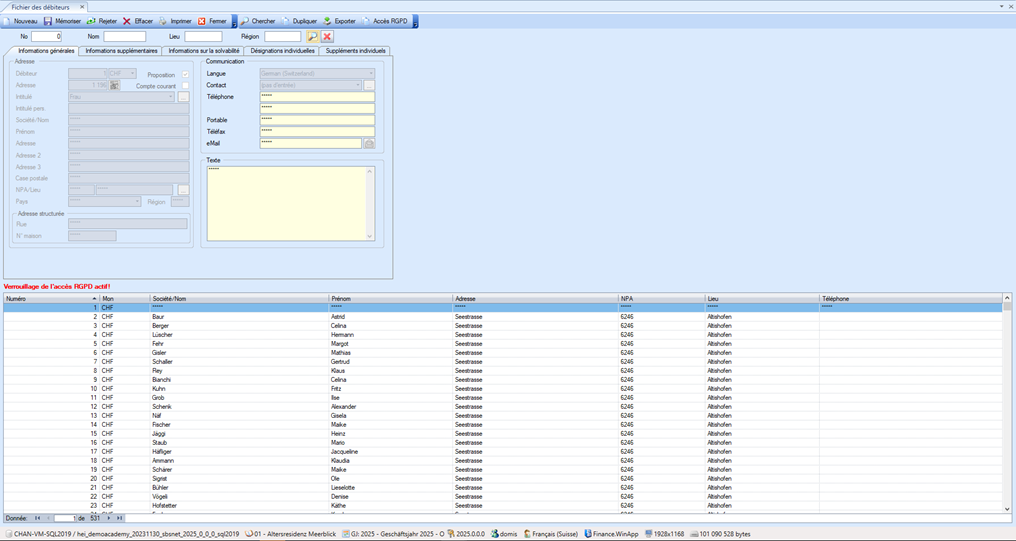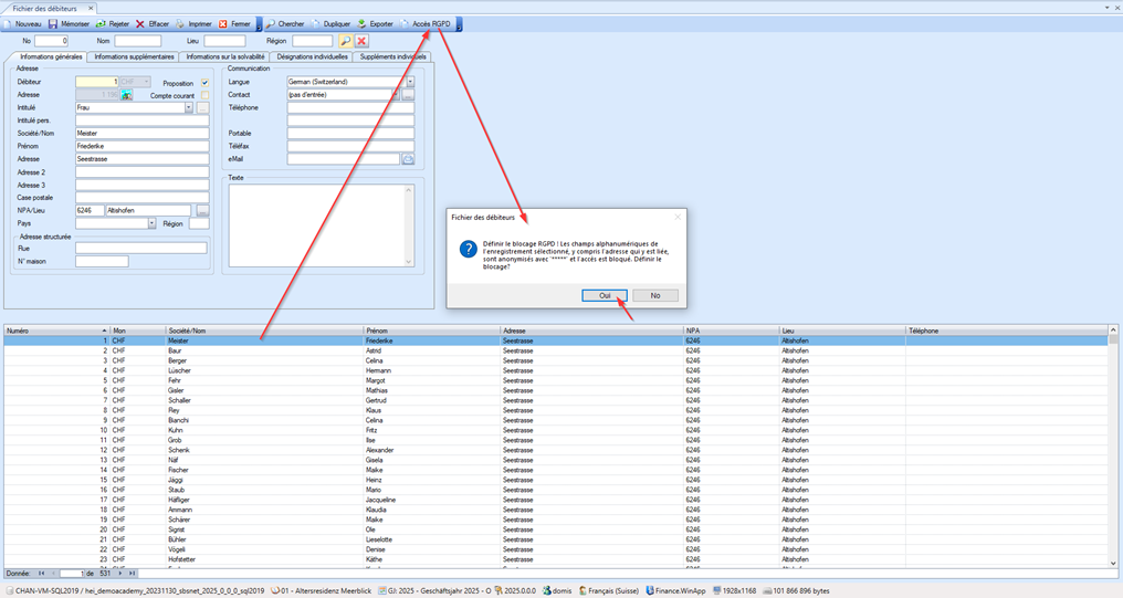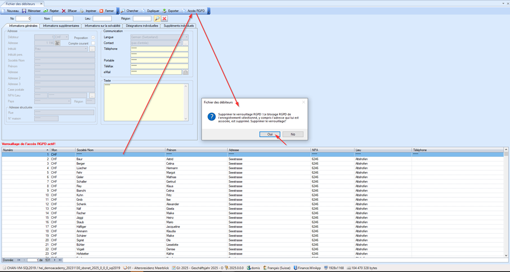 En cliquant à nouveau sur le bouton de la barre d'outils [Accès RGPD], le blocage de certains enregistrements (projets de commande/de cas, débiteurs, créanciers) peut être levé. La restauration des données est assurée par les données enregistrées dans le tabelle d'ombre.
