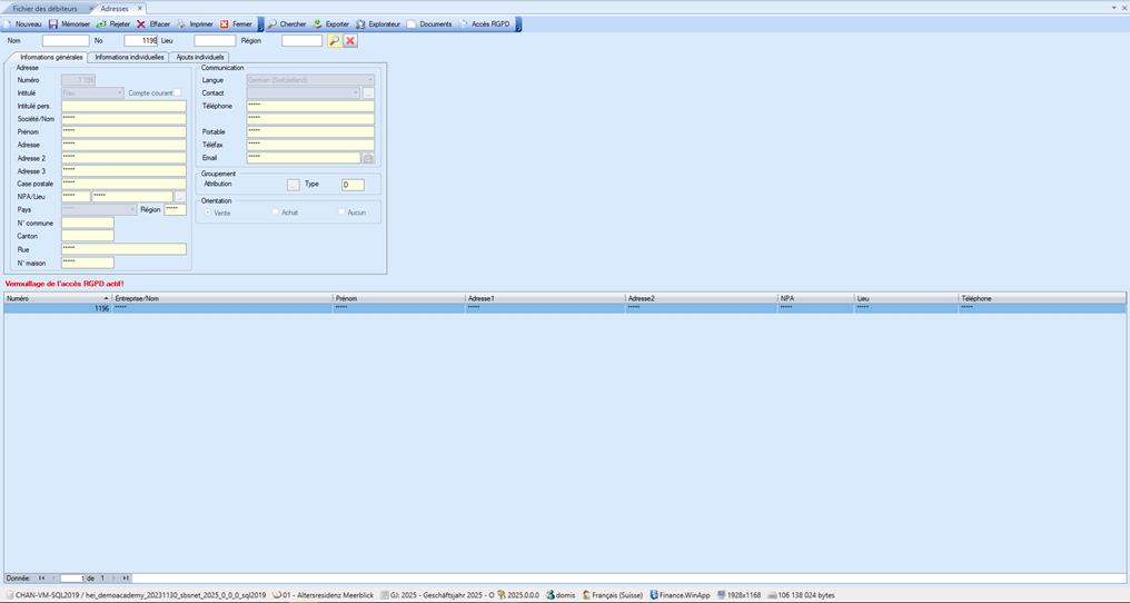 Dans les sous-chapitres suivants, la fonction du bouton de la barre d'outils [Accès RGPD] est expliquée à l'aide d'un exemple :