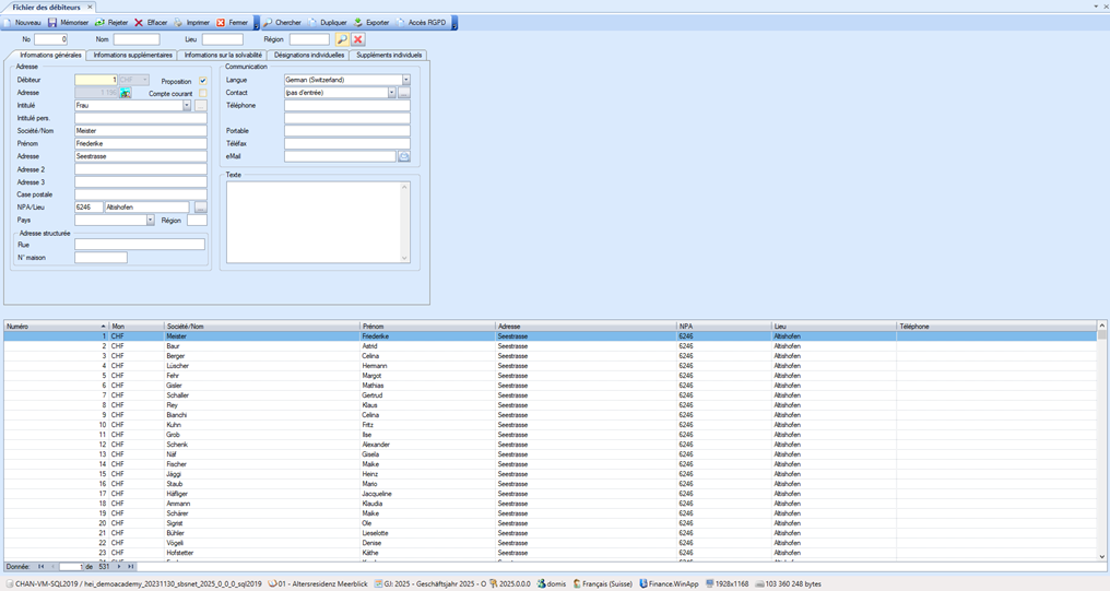 Débiteurs, Adresse des débiteurs, Adresses de rappel des débiteurs | Dans la pratique, les débiteurs, les adresses des débiteurs et les adresses de rappel sont transférés par les applications de facturation intégrées dans le cadre de la comptabilisation des factures dans la comptabilité des débiteurs NEXUS/FINANCE en tant que facture des débiteurs. L'application de facturation (NEXUS/PATNG, NEXUS/PATCL, NE-XUS/HEIM, NEXUS/SPITEX ou des applications de facturation de tiers) a la maîtrise de ces données. Les adresses des débiteurs et des rappels sont liées aux personnes lorsqu'il s'agit de transactions commerciales B2C. Il s'agit donc de factures adressées à l'utilisateur final, comme les patients (NEXUS/PAT), les résidents (NEXUS/HEIM), les clients (NEXUS/SPITEX), etc. | Débiteur, Adresse |