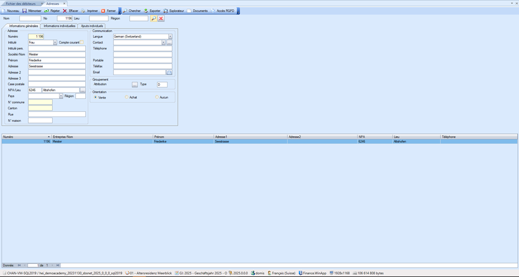 Si un enregistrement est bloqué dans le projet de commande/cas, la base des débiteurs ou la base des créanciers, l'adresse correspondante dans la base des adresses est également bloquée: