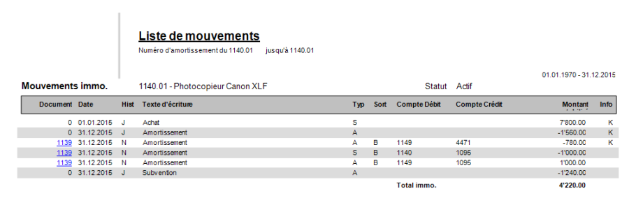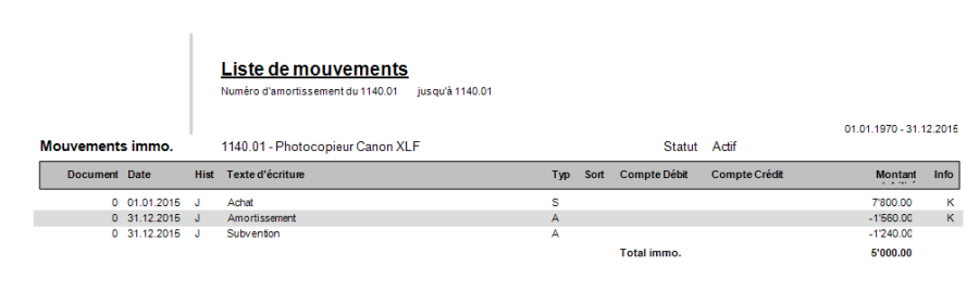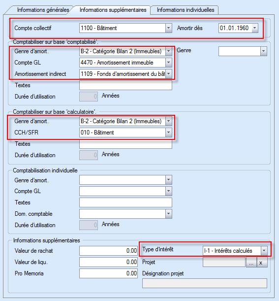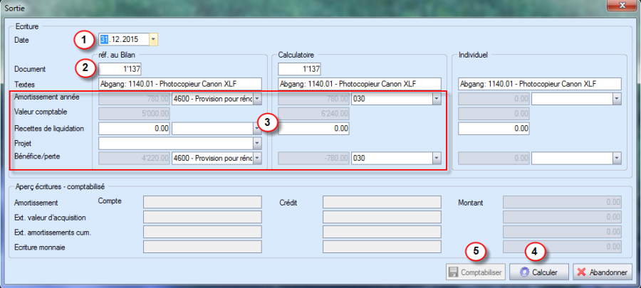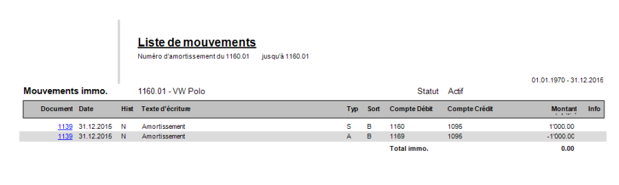 Jusqu'à la date de liquidation, les amortissements correspondants doivent être calculés (solde comptable <> 0), si aucun amortissement n'était prévu jusqu'ici.. Si cela n'est pas souhaité, avant l'utilisation de cette fonction, choirir un type d'amortissement dans les données de base qui ne calcul aucun amortissement (par exemple 0 pas d'amortissement).