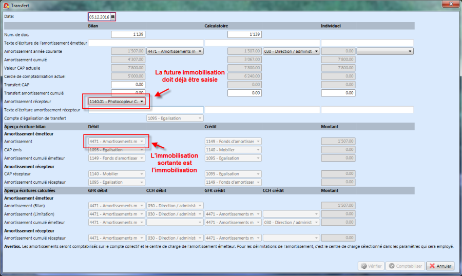 Avec la fonction „Vérifier" les amortissements sont vérifiés en incluant également le CCH de différence d'incorporation (Attribution CCH/GFR).