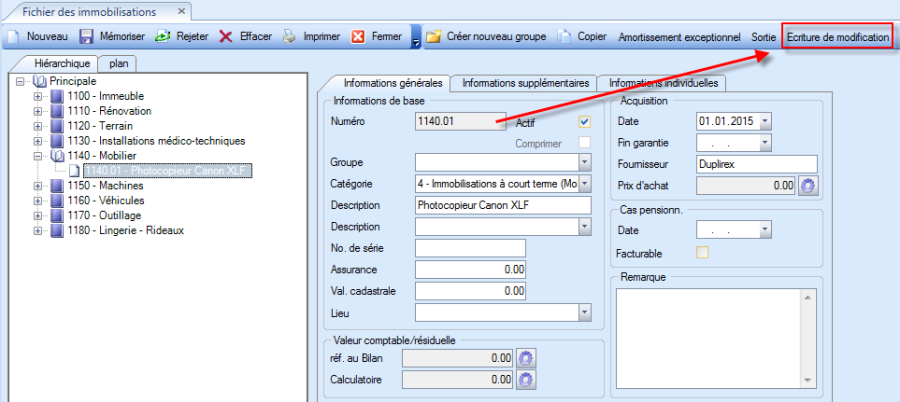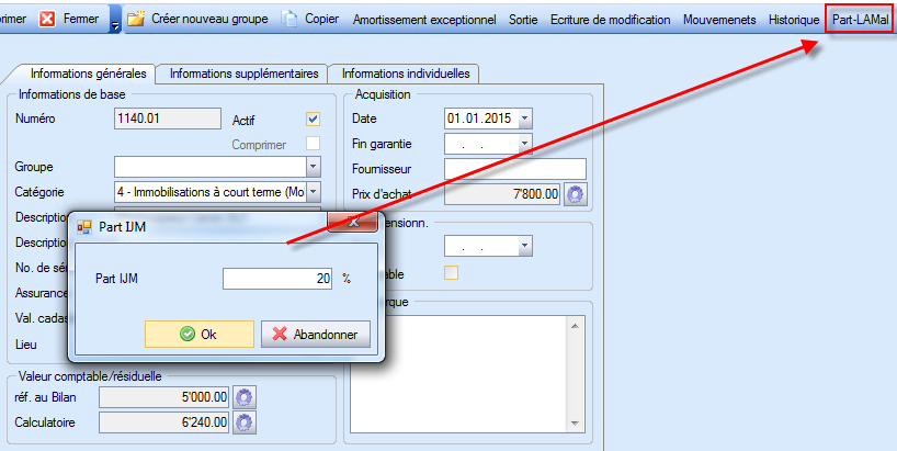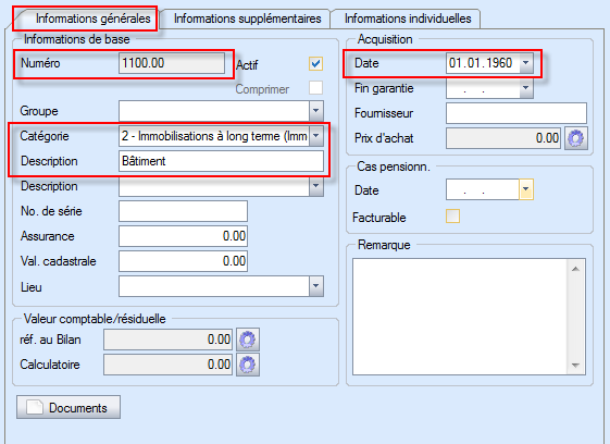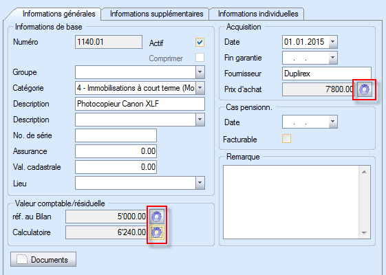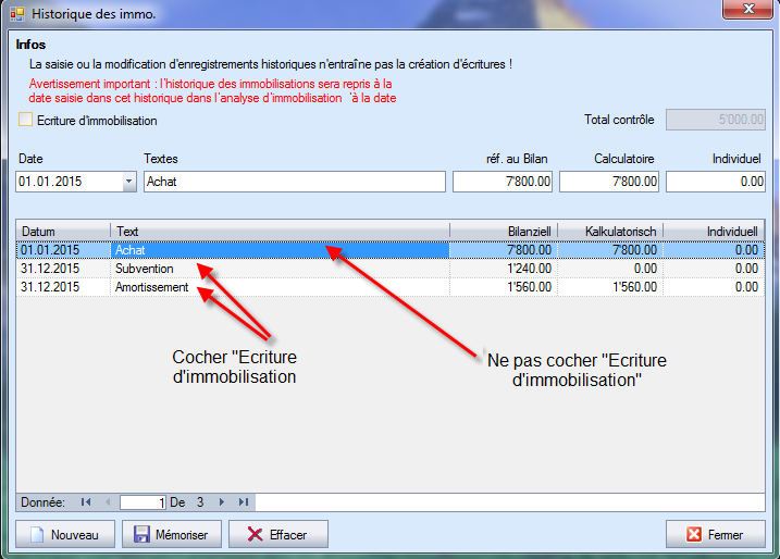 - La date valeur de l'écriture créancier ou autre est la date d'acquisition. L'immobilisation doit être saisie et sera affichée. (réf. au Bilan et Calculatoire avec CHF 7'800.00)