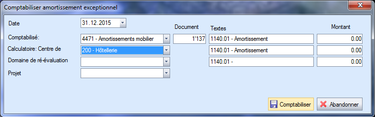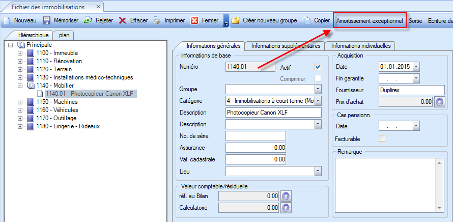 Avec la fonction Amortissement exceptionnel, il est possible de saisir un amortissement spécial.