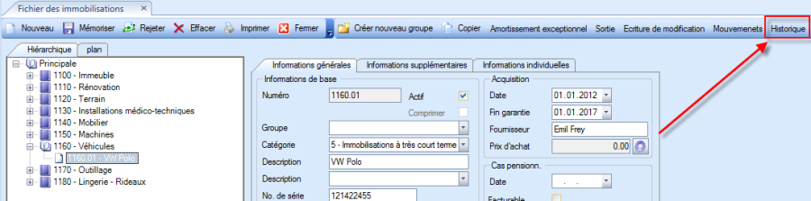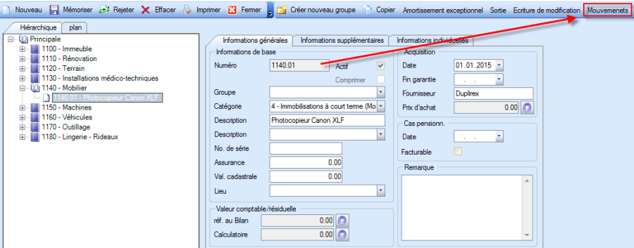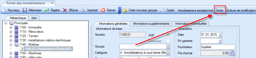 Dans les données des immobilisations, il est possible de saisir une liquidation au moyen du bouton „Sortie.