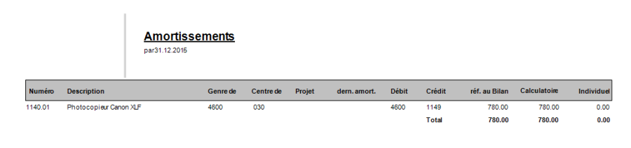 - amortissement dans l'historique (Bilan SFr. 1'560.00 / calculé SFr. 1'560.00)