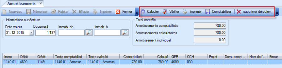 Les déroulements d'amortissements déjà traités peuvent être au besoin et selon les exigences du système (écritures pas encore clôturées, pas de nouvel amortissement effectué, pas de clôture annuelle effectuée) supprimés à tout moment et être traités à nouveau.