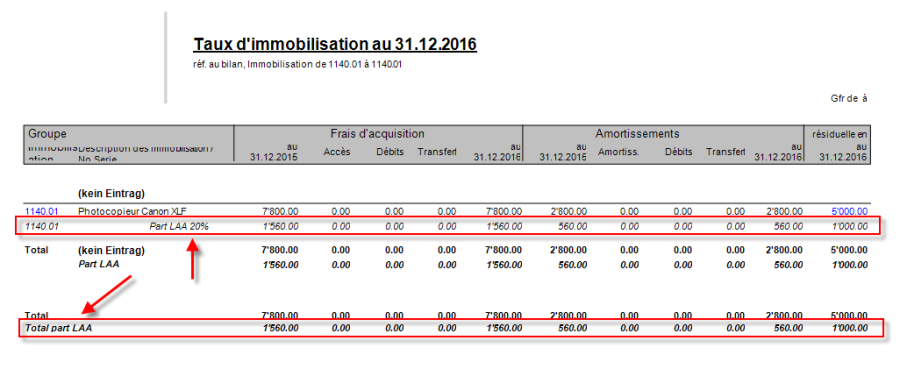 La part LAMal saisie apparaît sous chaque immobilisation et au total dans l'analyse Analyse d'immobilisation. Cette part LAMal est nécessaire pour la statistique SOMED.