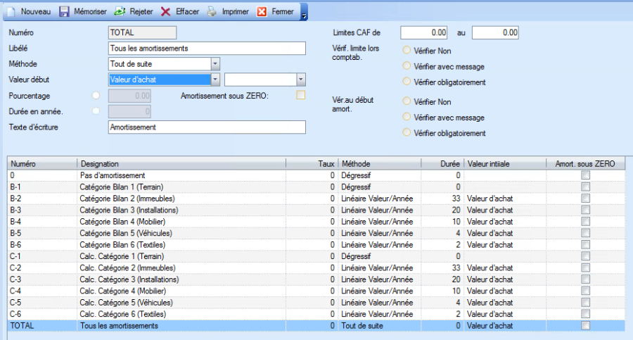 Si aucun amortissement automatique n'est souhaité, il est possible de mettre le code 0 (aucun amortissement).