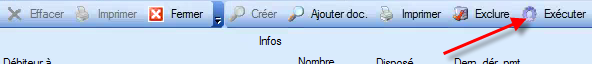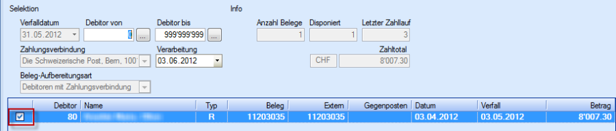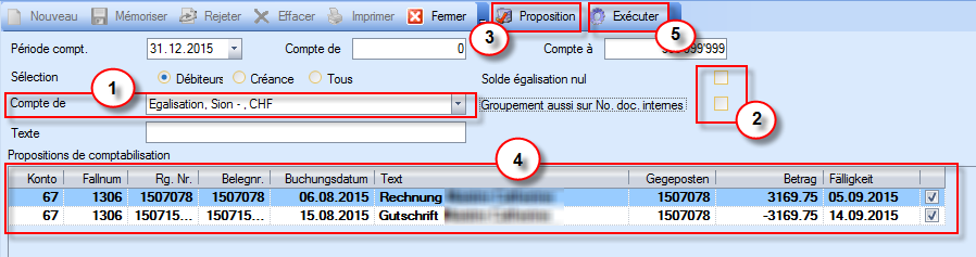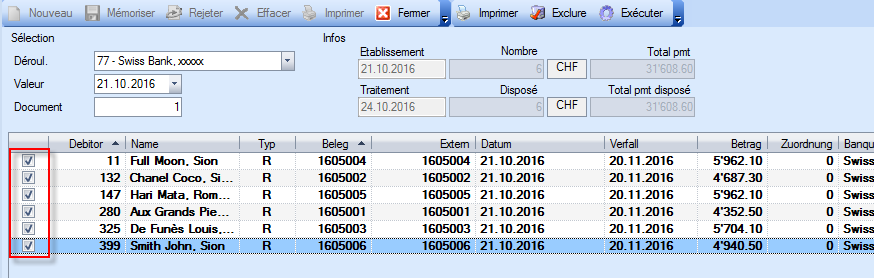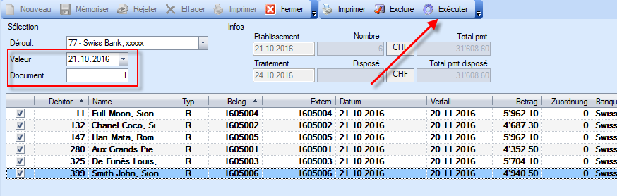 Quand seuls les débiteurs ayant leur compte débité sont encore sélectionnés, le déroulement peut être comptabilisé. La date de comptabilisation sera insérée dans Valeur et le numéro de comptabilisation sera inséré dans Document. Avec le bouton Exécuter, le déroulement sera définitivement comptabilisé dans la finance.