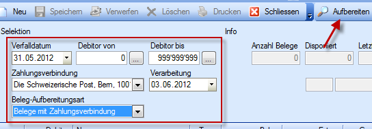 Entrer la date d'échéance des factures (Verfalldatum), la relation de paiement choisie et le document – genre de traitement. Le document – genre de traitement (Beleg-Aufbereitungsart) doit impérativement être „Belege mit Zahlungsverbindung". Via Verarbeitung, la date de traitement est choisie. Quand les filtres sont remplis comme souhaités, via Aufbereiten, la proposition de déroulement est créée.