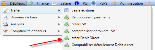 Pour déclencher le déroulement Debit Direct, celui-ci doit en premier temps être créé. Le déroulement Debit Direct peut être créé via Débiteurs, Traiter, Créer Debit Direct.