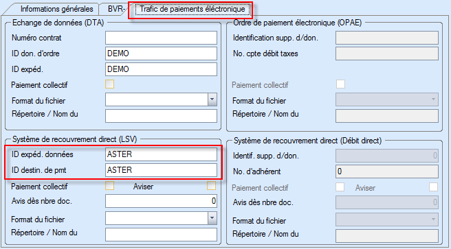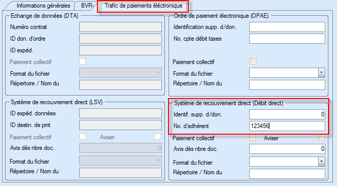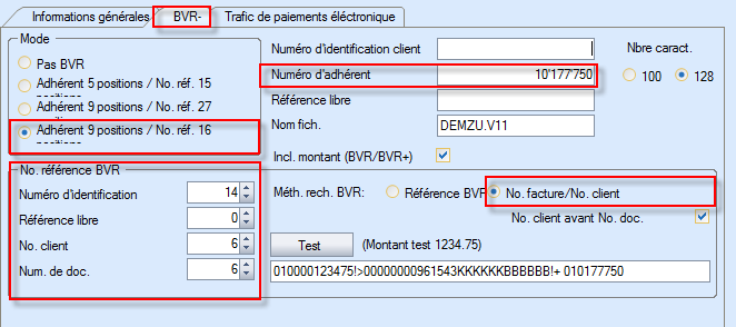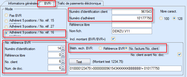 Le réglage du numéro de référence BVR est très important et doit être correct à 100% parce que cette information est spécifiée dans le fichier Debit Direct. Les données incorrectes sont rejetées.