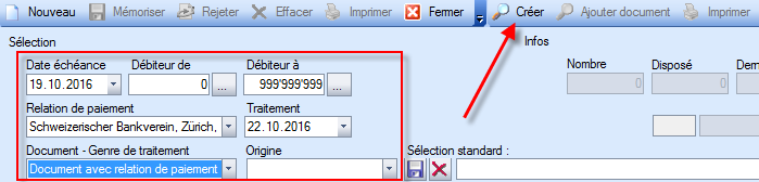 Entrer la date d'échéance des factures, la relation de paiement choisie et le document – genre de traitement. Le document – genre de traitement doit impérativement être „Documents avec relation de paiement". Via Traitement, la date de traitement est choisie. Quand les filtres sont remplis comme souhaités, via Créer, la proposition de déroulement est créée.