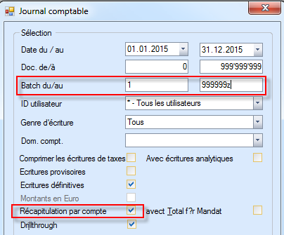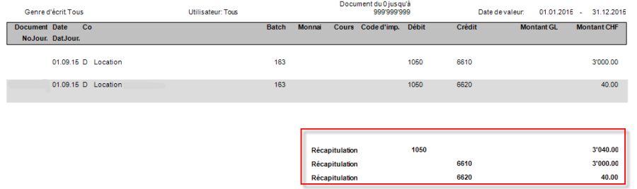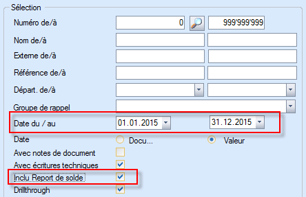 Remarque: Attention: Lorsqu'une période d'évaluation est sélectionnée, le solde n'est pas forcément correctement affiché. Pour que cela soit le cas, il est nécessaire d'activer l'option „Inclus Report de solde". Dans le cas contraire, tous les mouvements antérieurs à la période choisie ne seront pas pris en compte. Cette option peut aussi être activée automatiquement dans une sélection standard.